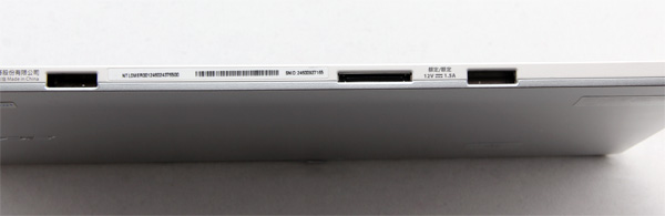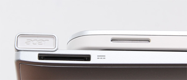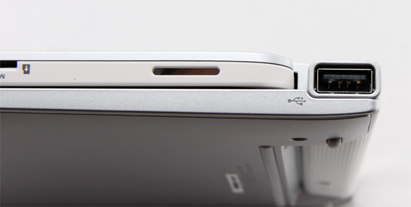 Левый торец снизу - динамик. Кстати, расположение динамиков для использования в качестве планшета - более чем неудачное: когда планшет держится двумя руками, динамики закрываются ладонями. Вот как можно было такое придумать - не понимаю.