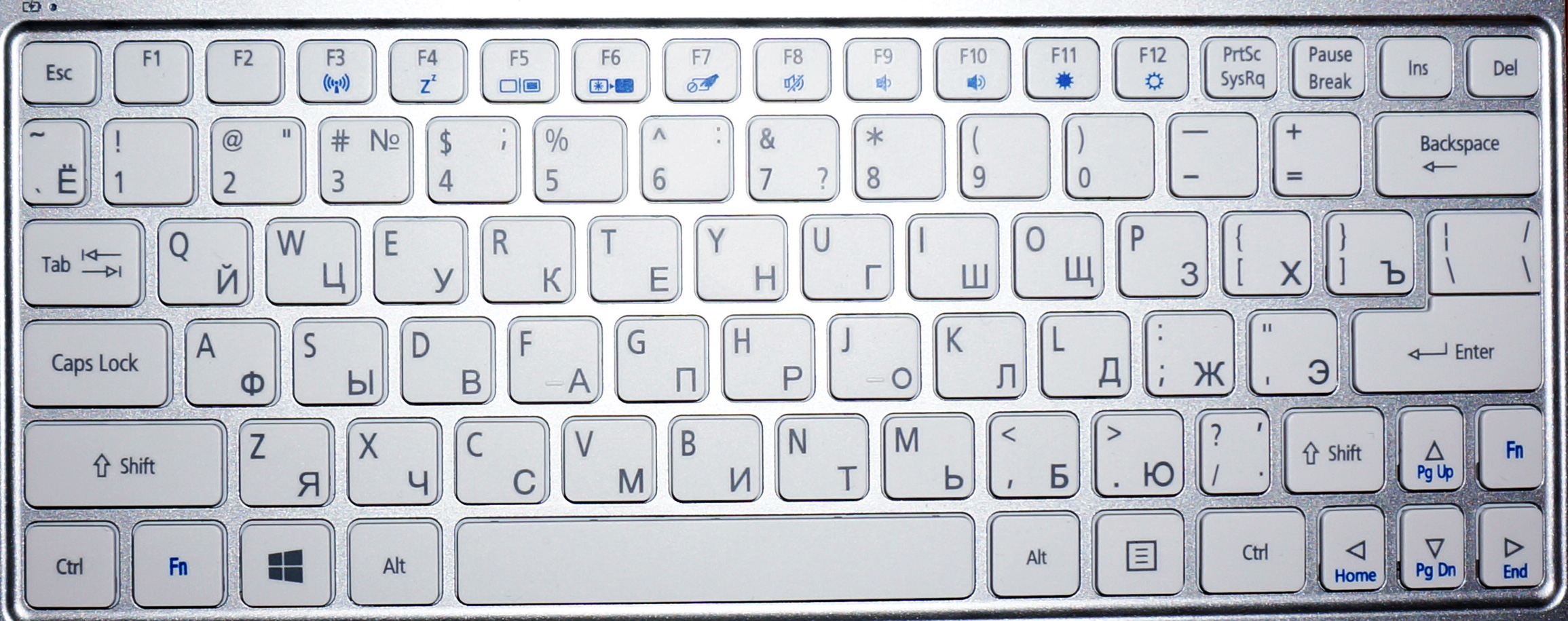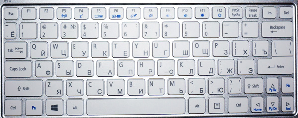 Клавиатура, на мой взгляд, спроектирована хорошо (в отличие от шокирующих решений в Acer Aspire S7). Расположение - очень грамотное для такого небольшого размера, набор клавиш и функций через кнопку Fn достойный, ход небольшой, но внятный - в общем, понравилась. Единственное, что плохо продумано, - это то, что клавиатура лежит в небольшом углублении по сравнению с остальной частью док-станции. При этом если печатаешь десятью пальцами, то большими пальцами трудно нажимать пробел - они попадают на кромки углубления. Но это проблема тех, кто печатает десятью пальцами. Двумя пальцами печатать очень удобно - скорость потрясающая.