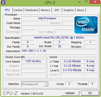 Процессор: Intel Atom Z2760 (1,8 Ггц), двухъядерный