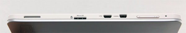 Правый торец: динамик, слот карты microSD, microUSb (есть переходник под обычный USB 2.0), microHDMI (нет переходника), качелька регулировки громкости, микрофон.