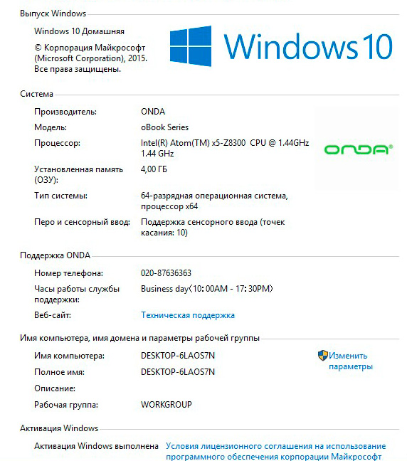 Информация о системе. Кстати, вроде бы Windows 10 тут установлена лицензионная: система активировалась без проблем. Однако лицензионной наклейки с кодом на планшете не наблюдается. (Но, насколько я знаю, начиная с какой-то версии Windows наклейка с лицензией уже необязательна.)