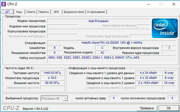 Процессор: Intel Atom X5 Cherry Trail Z8300, 1,84 ГГц