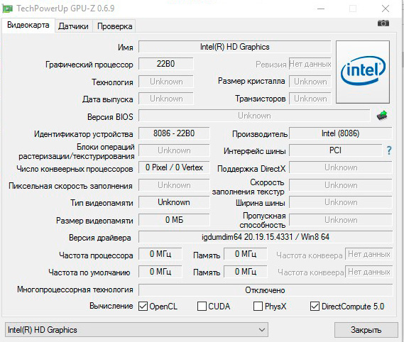 GPU-Z взять бы поновее версию. Древняя 0.6.9 от 2013-го года совсем не знает этот атом и ничего полезного не показала...