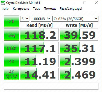 Быстродействие встроенной памяти по Crystall Disk Mark.