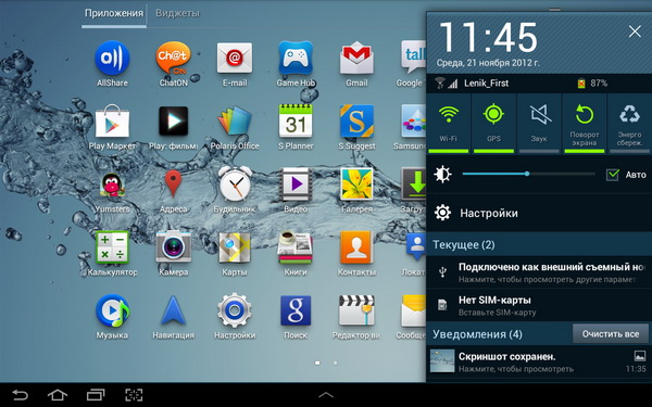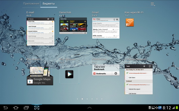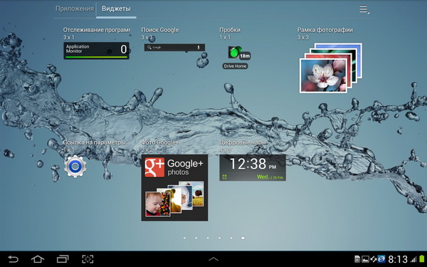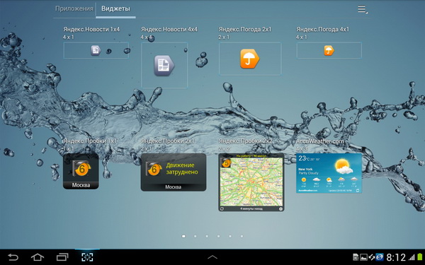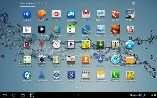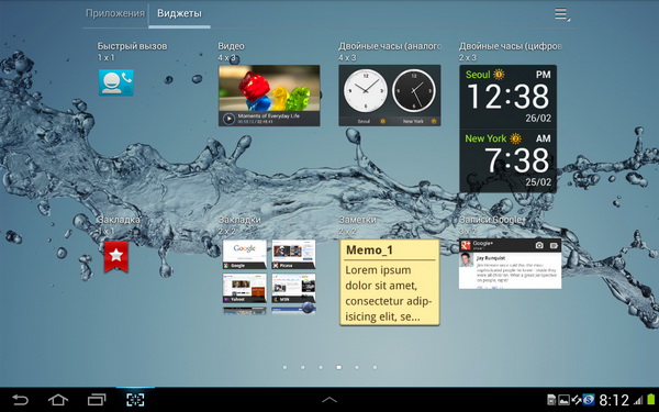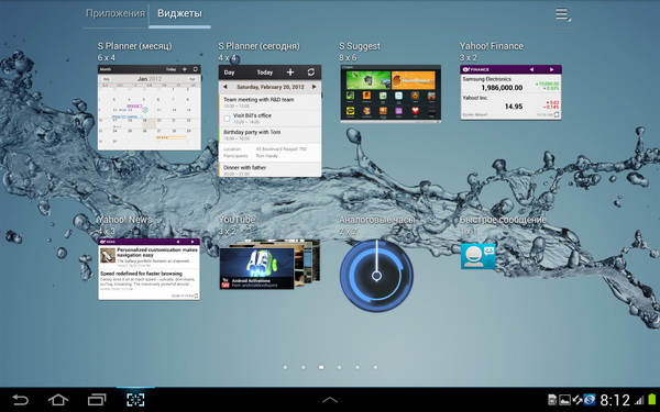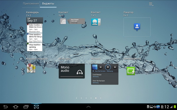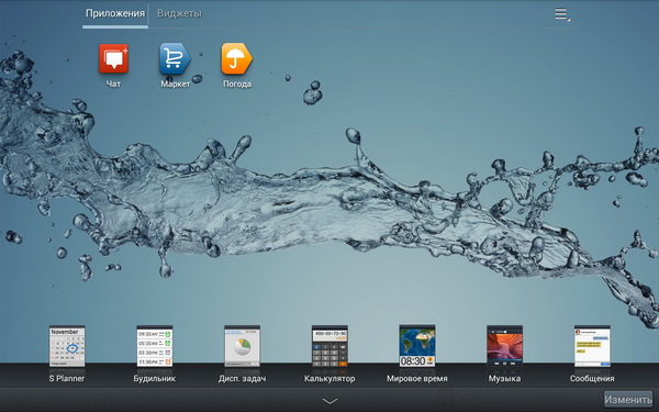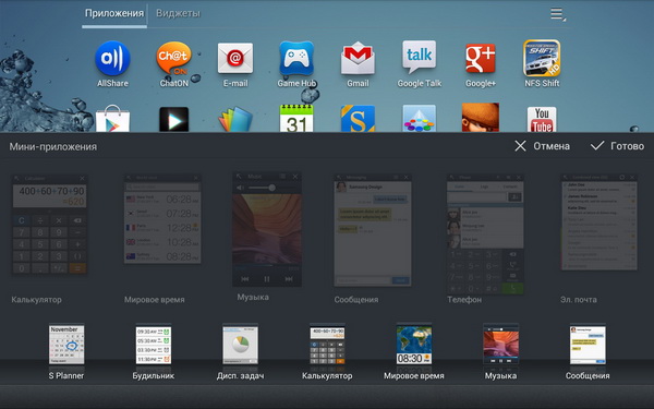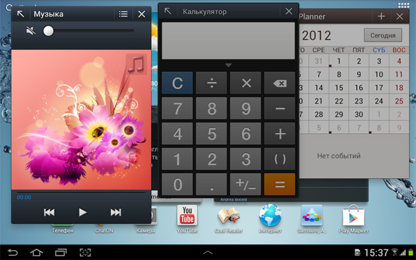 Одна из специфичных особенностей самсунговских планшетов - центральная стрелка в нижней панели, нажатие которой вызывает появление панели с так называемыми мини-приложениями. При нажатии на пиктограмму такого приложения на экране появляется не полноценная программа, а небольшое приложение в виде окна. Таких окон можно открывать сколько угодно и переключаться между ними.
