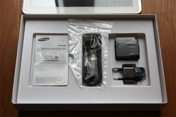 Комплектация - планшет, специализированный провод USB, адаптер питания, брошюрка.