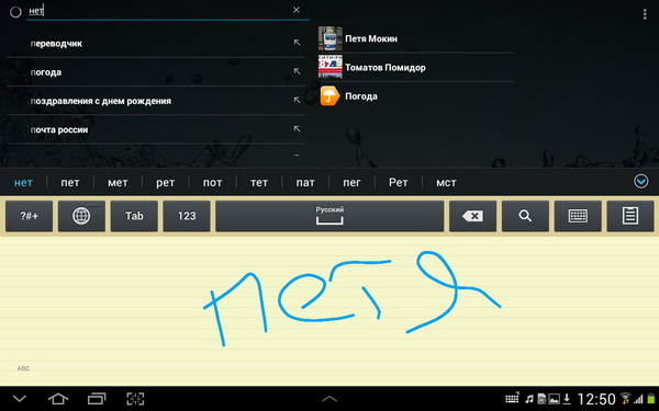 Режим распознавания рукописного текста. Распознает терпимо, но, чтобы таким образом быстро вводить текст, нужно иметь стилус.