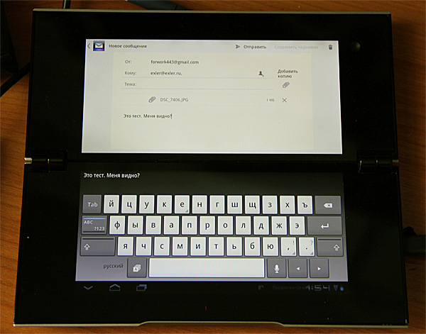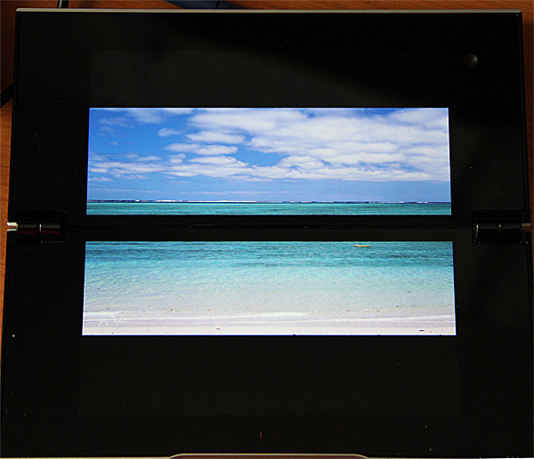 Сначала поговорим об особенностях двухдисплейной реализации. Это решение имеет как свои плюсы, так и минусы. Плюсы - очень удобно работать с экранной клавиатурой в приложениях, которые ее используют. Вот с этим -  просто блеск! Ставишь экраны под углом, смотришь на верхний дисплей, печатаешь на нижнем - отлично!