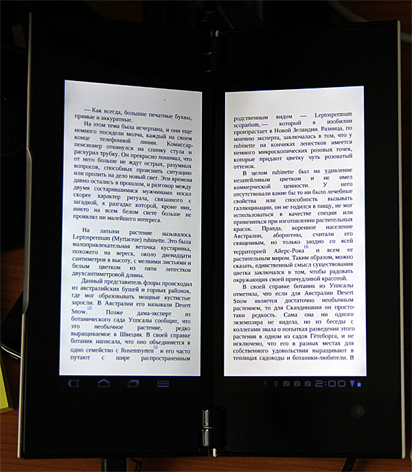 Второй положительный момент - чтение книг в ридере. Причем если с обычным планшетом стараешься читать в альбомной ориентации, выводя разворот страниц, то тут как раз очень удобно читать в портретном режиме, когда планшет сам разбивает книгу на две страницы.