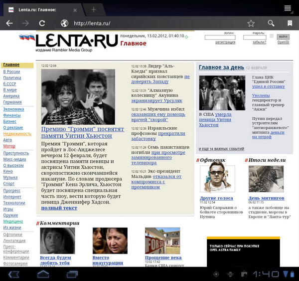 По программе Quadrant индекс быстродействия выдается 1874 - это прилично. Для сравнения, у Samsung Galaxy Tab 10.1 - 1993, у Motorola XOOM - 1926.