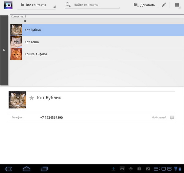 Контакты тоже затачиваются под два экрана - сверху список, снизу подробные данные выделенного контакта.