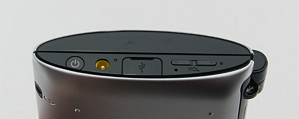 В правом торце - кнопка питания, выход под адаптер питания, microUSB под специальной крышкой и клавиши регулировки уровня звука. Выход на наушники - справа снизу на скошенном торце.