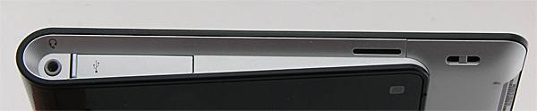 На левом торце - выход аудио 3,5 мм, закрытый специальной заглушкой слот с USB 2.0 micro A/B и слот под SD(HC)-карту. Ниже - левый динамик и загогулина для петельки.
