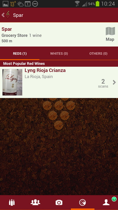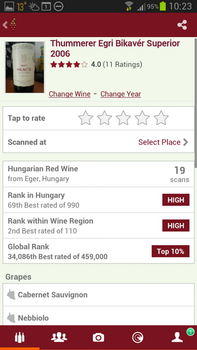Этикетка сканируется, и, если она более или менее пристойного качества и распознается, из базы заносится вся информация по данному вину. Причем кроме использованных сортов винограда, что ценно, также даются рейтинги как участников сети, так и общие рейтинги по стране, региону и глобальному рейтингу.