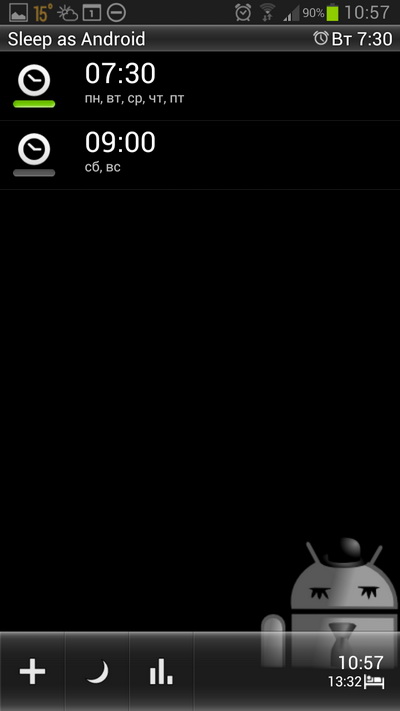 Довольно популярная программа Sleep as Android. Что делает? Будит вас легко и нежно. Нет, не поцелуем в ушко, но в оптимальной фазе сна. Чтобы вы просыпались в хорошем настроении и не убивали всех вокруг. Разумеется, для этого ей надо дать пространство для маневра, поэтому вы указываете крайнюю точку пробуждения и диапазон до того, во время которого вас можно будить, - обычно указывается полчаса, но можно задавать любой период от 5 минут до 2 часов. Также тут поддерживаются графики сна, статистика дефицита сна, предлагаются всякие мелодии природы и так далее.