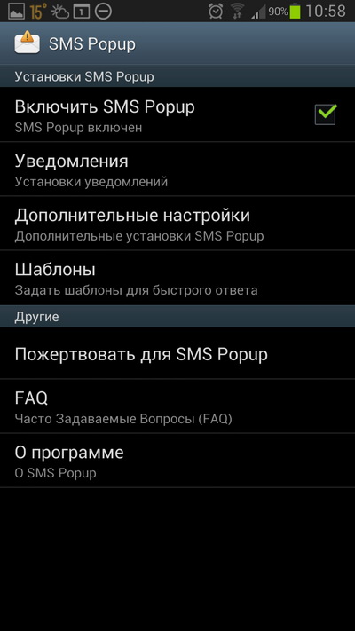 Если вам нравится, как работают SMS в вашем телефоне, но хочется иметь всплывающие SMS как в iOS - тогда можно поставить программку SMS Popup. Вот ее настройки.
