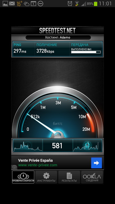 Утилита Speedtest.net Mobile. Красиво и наглядно выдает результаты тестирования интернет-канала.
