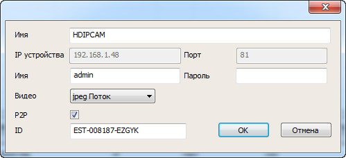 Поле пароля должно остаться пустым (позже его можно будет задать), и тут самое главное - в разделе "Видео" поставить "H264 Главный поток", иначе камера не подключится. (Я поначалу на эти грабли наступил.)