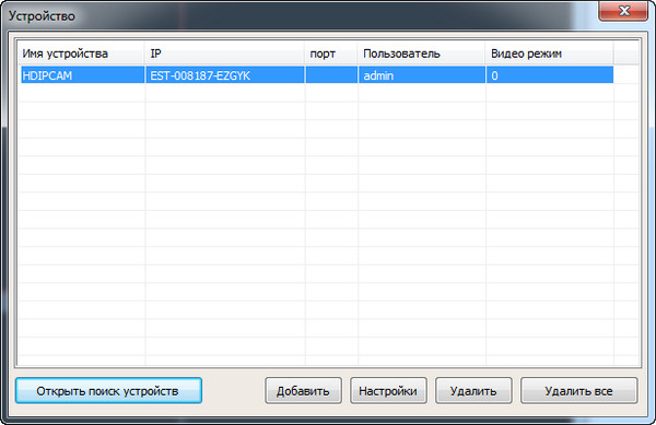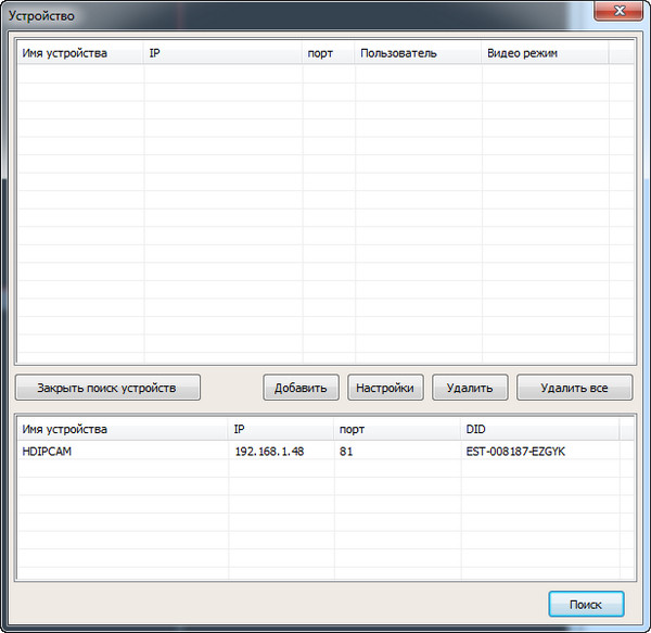Там надо нажать на кнопку "Список камер", в появившемся окне нажать "Поиск устройств" и "Поиск". Камера будет обнаружена.