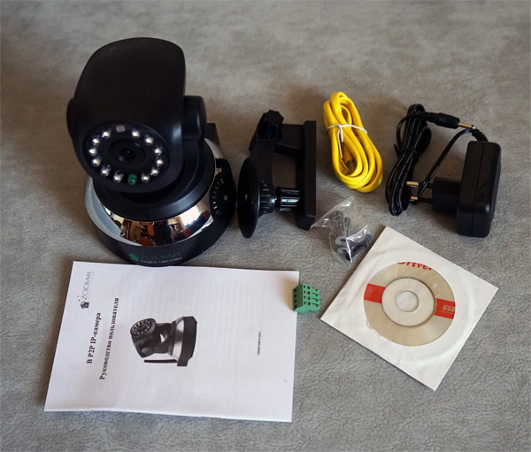 Комплектация: камера, кабель Ethernet, антенна Wi-Fi, адаптер питания, крепление с набором винтов, диск с ПО, руководство пользователя, гарантийный талон.