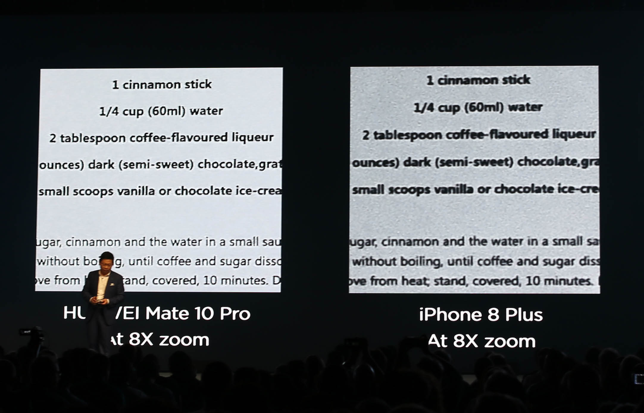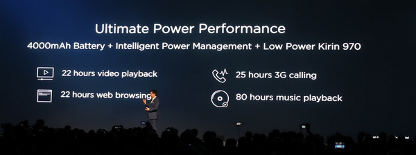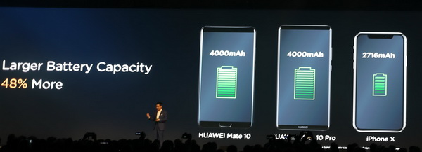 Далее тут же первый пинок iPhone X - у них батарея всего 2716 мА·ч, а у Mate 10 и 10 Pro - 4000 мА·ч. Кстати, это будет тенденцией всей презентации: в Huawei считают главными конкурентами айфон и Samsung Galaxy (и это правда, хотя я ZTE с Nubia не сбрасывал бы со счетов) и там будут сравнивать характеристики с ними.