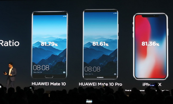 Соотношение экрана и поверхности в Mate 10 и iPhone X. Сравнение, на мой взгляд, не слишком корректное: чего там считать проценты, когда визуально у iPhone X экран выглядит как бы вообще занимающим всю переднюю поверхность? Нет, я тоже всегда готов попинать Apple, но я за справедливость.