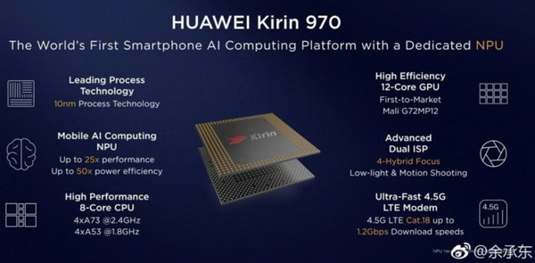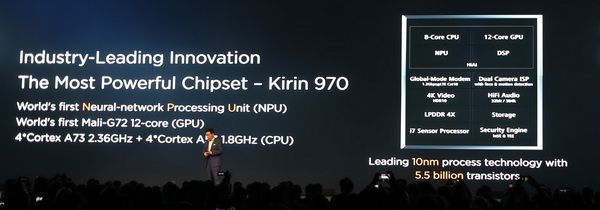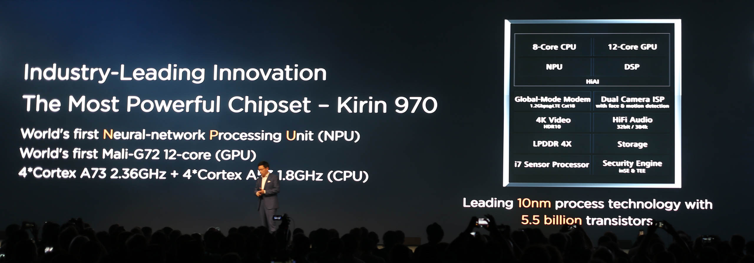 После дизайна заговорили о главном: о пламенном моторе этих флагманов - новом чипсете (SoC) Kirin 970 (напомню, что это собственный чипсет компании Huawei). Который вроде как действительно сейчас наиболее производительный SoC на рынке смартфонов.