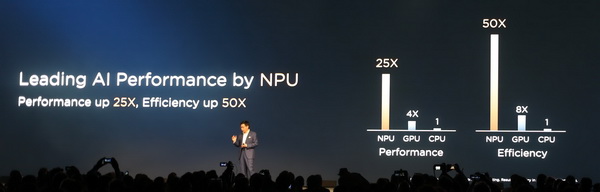 А ведь с его использованием скорость и эффективность работы, как нам сообщили, повысились в 25 и 50 раз. По сравнению с чипсетами, в которых NPU не было совсем. Зал на этом люто, бешено аплодировал.