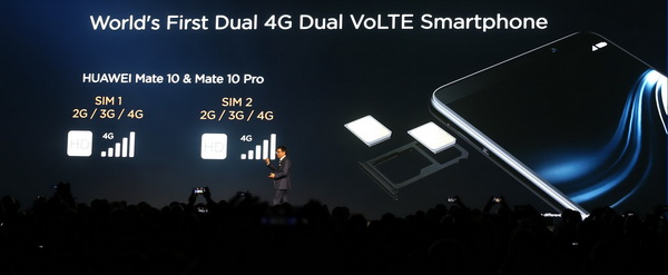 Вот также любопытная штука: они впервые сделали смартфон с одновременной поддержкой 4G на обеих симках. Такого действительно не было. Или основная на 4G, а вторая урезанная, или можно выбирать, какую назначить любимой 4G, но с ущемлением в правах второй симки, а тут обе в любом случае равноценные. На самом деле такое может понадобиться: например, я в поездке использую испанскую симку с домашним тарифом по всей Европе и Drimsim. И мне на обеих симках нужен 4G. Не то чтобы это было уж сильно критично, но как продвинутая возможность - можно только приветствовать. Кстати, замечу, что у моего Mate 10 Pro слот чисто под две сим-карты, а на презентации был слайд с комбинированным слотом, где можно ставить сим-карту и microSD, - видимо, это для Mate 10.