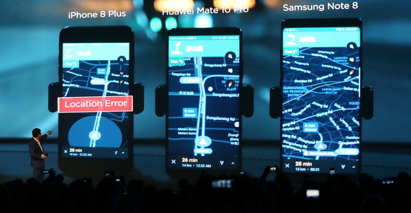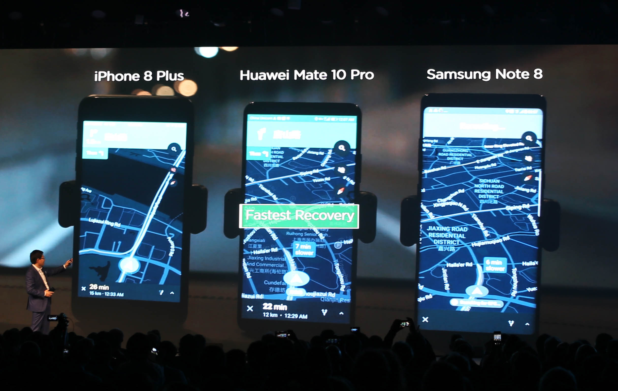Новые продвинутые технологии чипов определения координат. Разумеется, сравниваем с iPhone 8 Plus (ну ясно, что отстой) и с Samsung Galaxy Note 8, который чуть менее отстойный, но тем не менее. Тут идея в том, что в Mate 10, как было заявлено, более интеллектуальная обработка пропадания сигнала и восстановления его после пропадания. Проблема, кстати, известная, но надо смотреть, как реализовано.