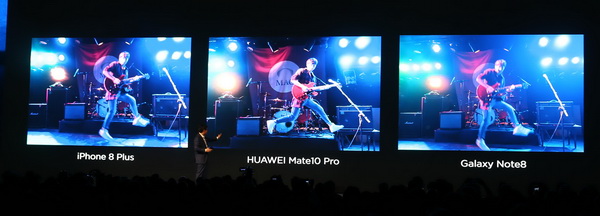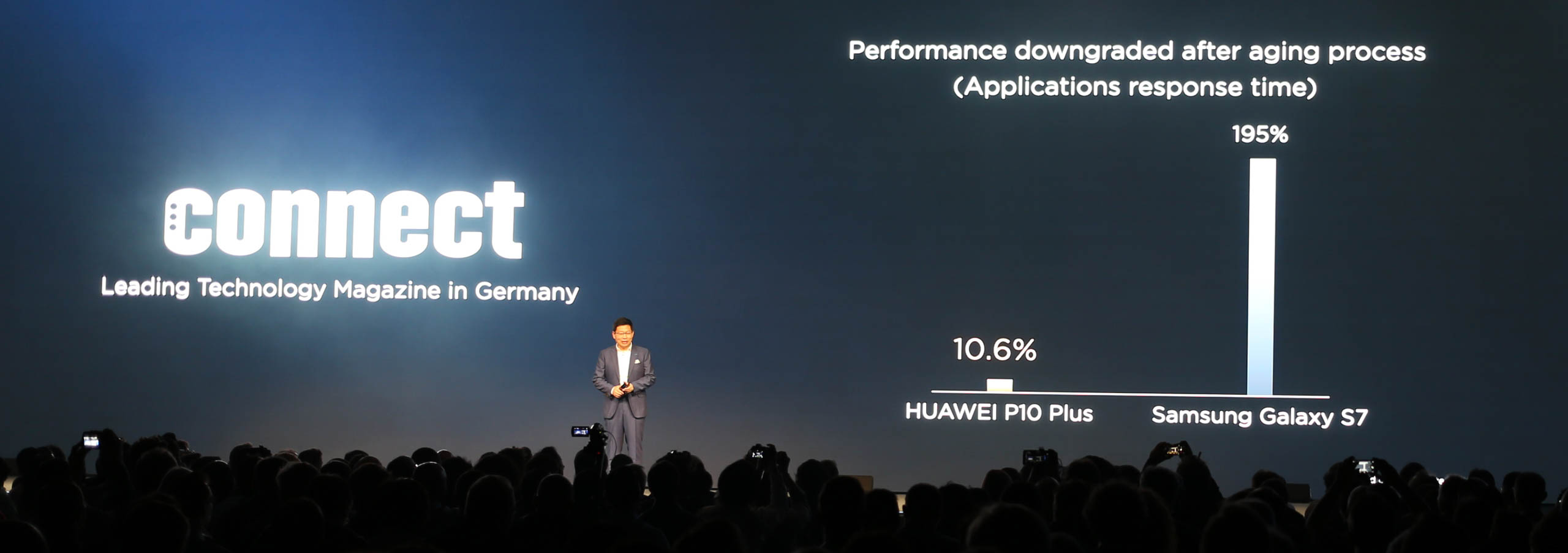Дальше пошло сравнение P10 Plus с Samsung Galaxy S7 с точки зрения ухудшения отклика приложений в процессе длительной работы. И P10 Plus был представлен полгода назад, и чего они вдруг Galaxy S7 вспомнили - совсем непонятно, но у P10 Plus отклик падает на 10,6%, а у Galaxy S7 - на 195% (то есть отклик занимает раза в два-три больше времени), как нам сказали, не приведя ни методики тестирования, ни условий, ни результатов. В общем, сравнили вчерашний джем с прошлогодним снегом. В зале вежливо поаплодировали - похоже, никто не заметил, что это не Mate 10 и не Samsung S8.