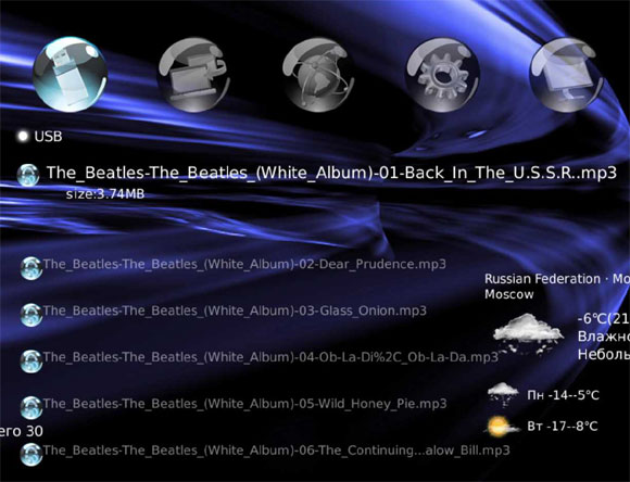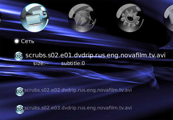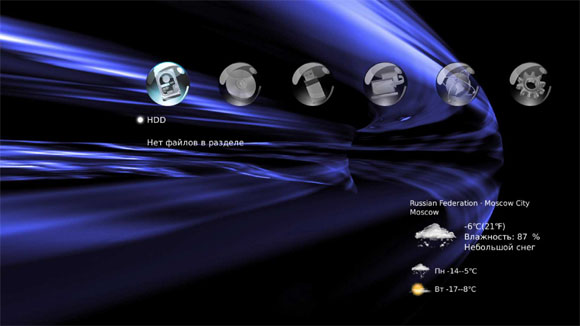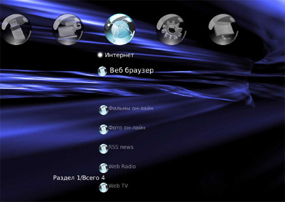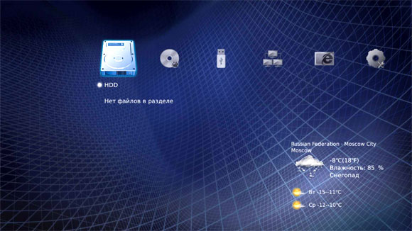 Главные пиктограммы следующие: жесткий диск, диск в приводе, подключения по USB, сеть, Интернет, настройки, онлайн-ТВ.