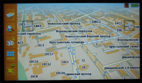 Поставил его в машину, поездил несколько дней по Москве. Работой навигатора остался, в общем, вполне доволен: адрес вводится легко и быстро; есть несколько вариантов прокладки маршрута; автоматическое изменение маршрута в случае отклонения от заданного; у карт очень хорошая детализация, включающая даже дворовые проезды; есть режимы 2D и 3D. Что не очень понравилось - явно замедленная реакция устройства на касания кнопок изменения масштаба. Впрочем, это переживаемо.