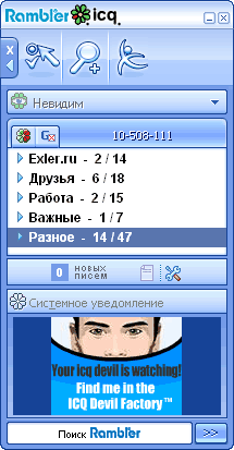 Выделенные мною "особенности Rambler-ICQ" - это стандартные возможности ICQ Lite 5. А уж по поводу "менять внешний вид" - так с точностью до наоборот, потому что здесь как раз базовая возможность ICQ (3 скина) в Rambler-ICQ урезана (хотя нормальные скины, конечно, можно отыскать самостоятельно, скопировать в папочку и подключить).