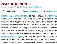 После этого я полез читать победные реляции по поводу нового продукта, которые появились в Рунете, и хорошо повеселился. Ну ладно еще когда в пресс-релизах Rambler базовые возможности пятой ICQ преподносятся как особенности Rambler-ICQ - в конце концов, это не обман, а как бы лукавство: дескать, Rambler-ICQ умеет проводить голосовые и видеоконференции, изменять стандартный "глазик", создавать свои статусы, устанавливать фотографии пользователей и так далее - ну да, Rambler-ICQ это все умеет, потому что это умеет обычная ICQ. Но когда журналисты в своих статьях начинают повторять все то же самое, причем уже в превосходной степени, становится просто смешно. Ребята, ну поставьте вы себе ICQ Lite 5, ну посмотрите, что она умеет. А потом уже сравните с ней Rambler-ICQ и объясните, чем она отличается.