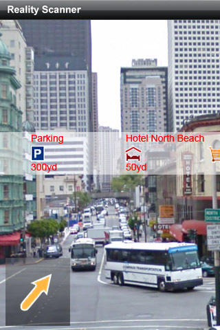 В Navigon есть такая интересная возможность, как Reality Scanner. Это когда он включает камеру смартфона, вы наводите ее на различные объекты, а Navigon показывает вам ближайшие точки интересов.