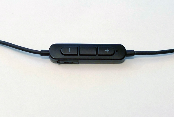 Кнопка посередине, как обычно, многофункциональная. Она включает и выключает гарнитуру (длинное нажатие), переводит ее в режим сопряжения (нажатие 5 секунд при включении), ставит воспроизведение на паузу, отвечает на телефонный звонок. Кнопки регулировки громкости при длинном нажатии переключают треки в плей-листе - соответственно, вперед или назад.