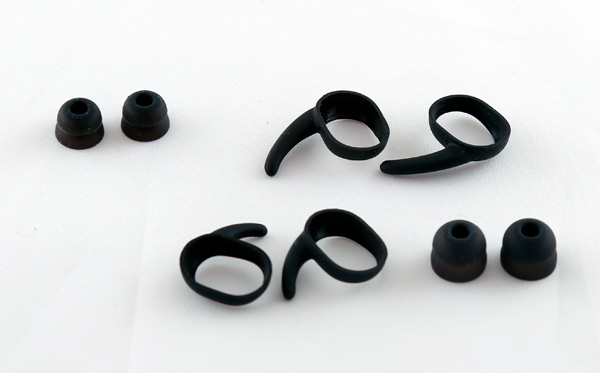Комплект поставки: наушники, зарядный кабель USB - microUSB, запасные амбушюры-вставки разных размеров (три двухфланцевых, два однофланцевых), запасные держатели "ушной крючок" (три пары), инструкция на английском и пластиковый слайдер-держатель.