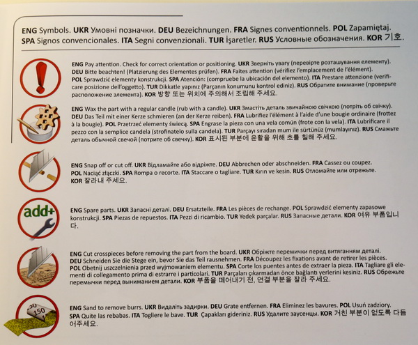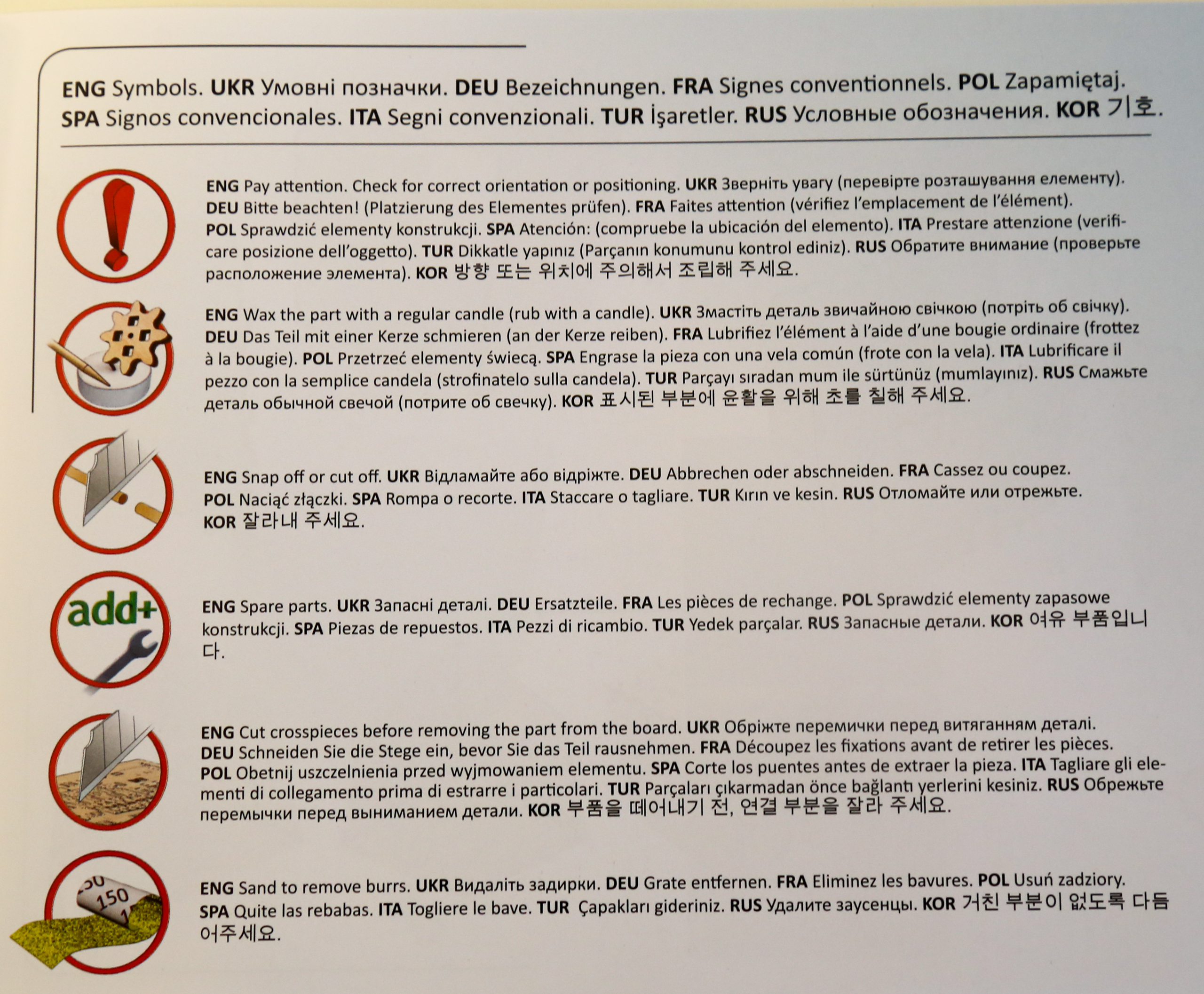 Инструкция на нескольких языках, также там используются определенные значки: обратить особое внимание, смазать поверхность свечкой, обрезать зубочистку, у этих мелких деталек есть запасные, обрезать перемычки и удалить заусенцы.