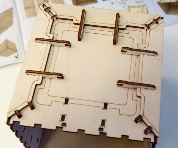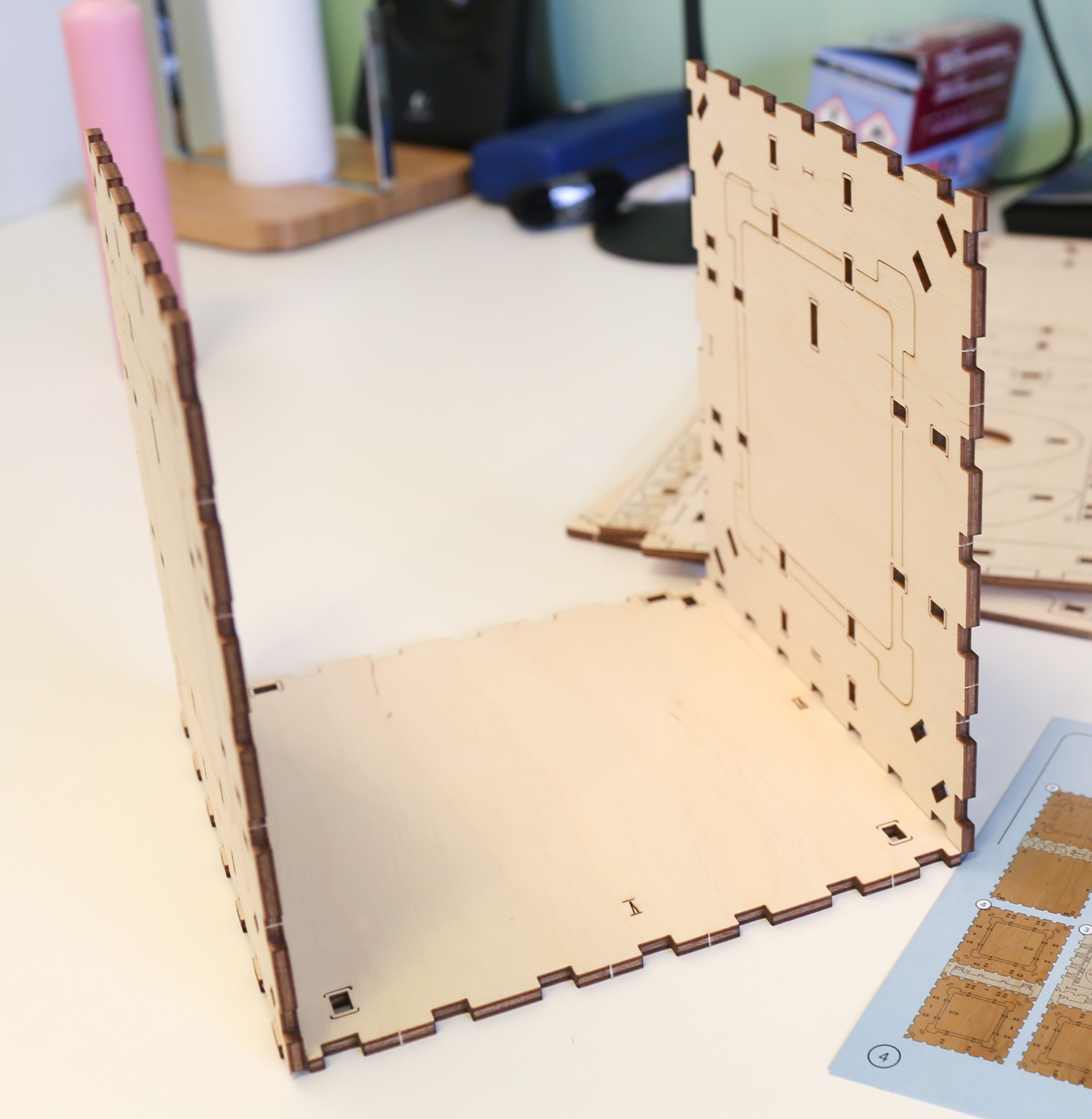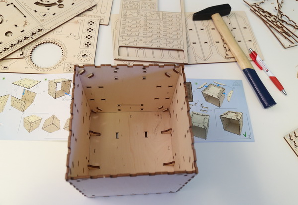 Однако здесь намного более сложная конструкция и много сочленений, которые входят друг в друга с заметным натягом, так что, честно говоря, одними руками обойтись не удалось: в некоторых случаях пришлось использовать небольшой молоточек, потому что я боялся, что при сильном нажатии руками сломаю деталь из тонкой фанеры. А с легким постукиванием молоточка все садилось в пазы, как надо.