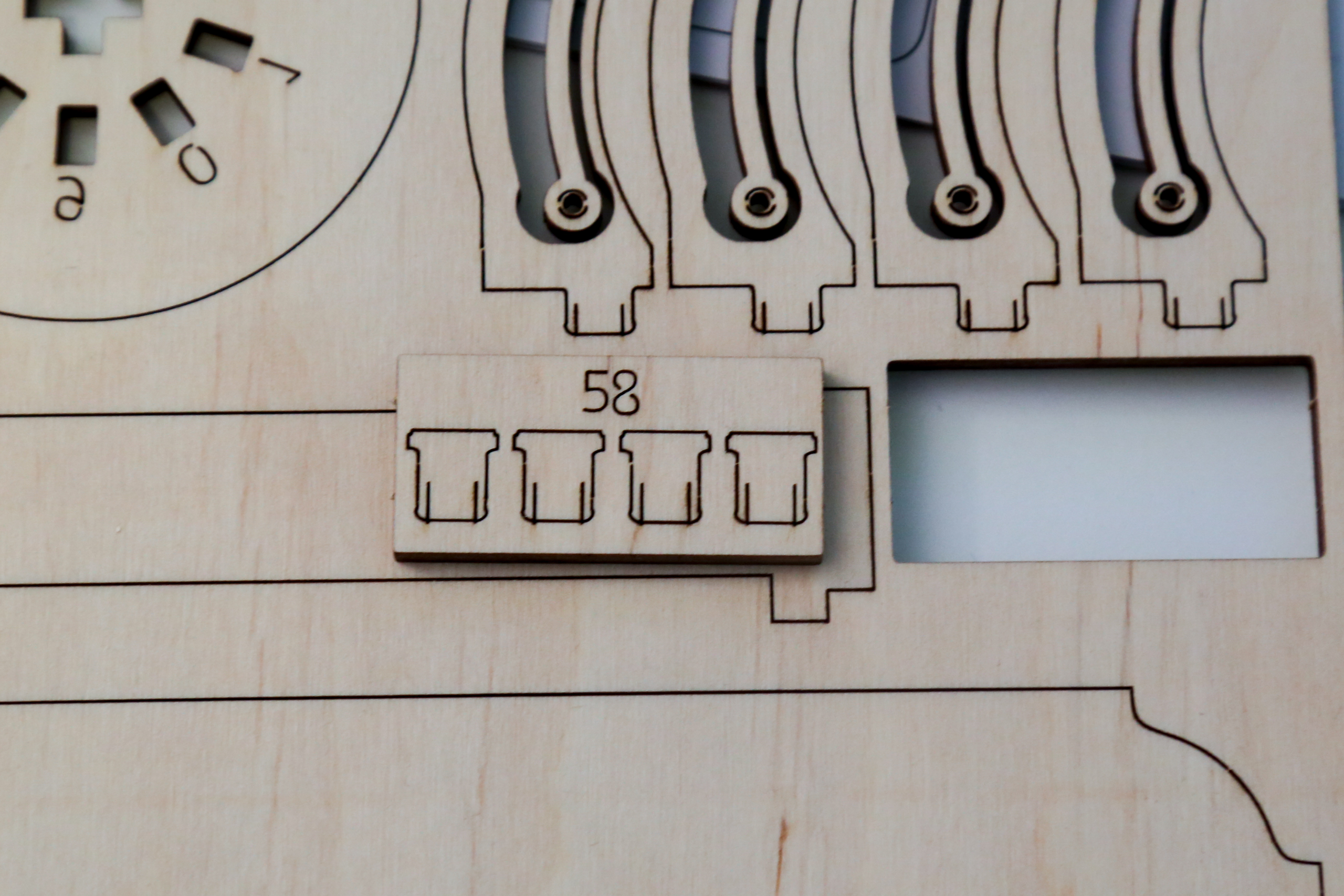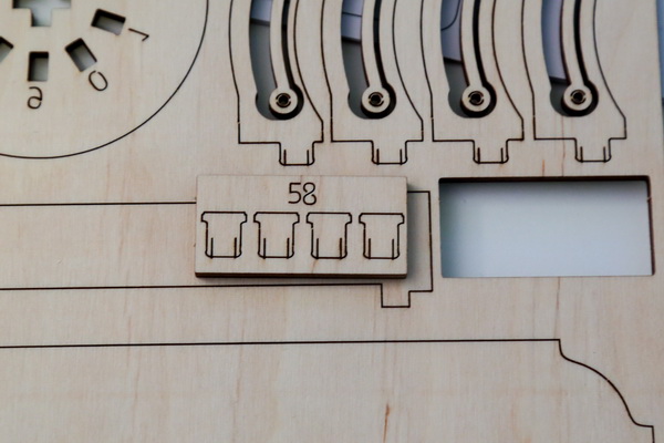 Вот такие совсем мелкие детальки реально было сложно выламывать руками - они слишком маленькие по отношению к толщине фанеры. И мы для таких деталек использовали пишущую ручку с надетым на нее пластиковым колпачком: вот кончиком этого колпачка и выламывали.