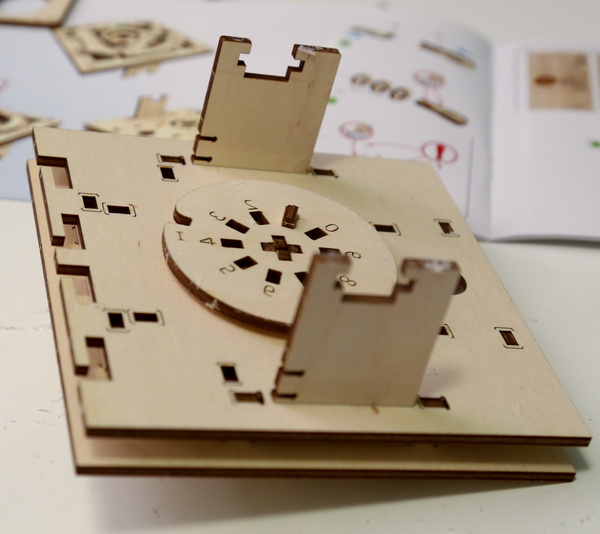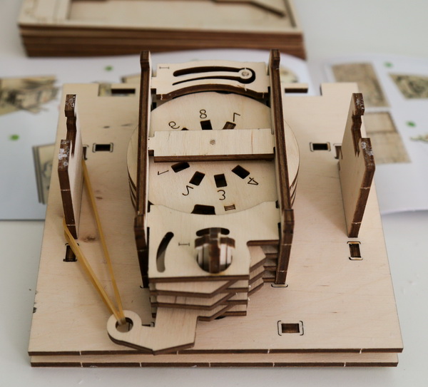Установка трех поворотных колес механизма (по одному колесу для каждой цифры). Там эти шпенечки надо очень четко по инструкции поставить, а то механизм нормально работать не будет. Кроме того, в инструкции как-то очень нечетко написано, каким образом можно установить свой собственный код. Хотя это, в общем-то, не слишком большая проблема.