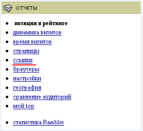 Нас интересует рубрика "ссылки" (это и есть реферреры). После клика мышкой, слева вы увидите следующую картину: