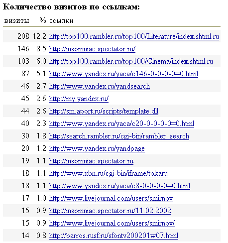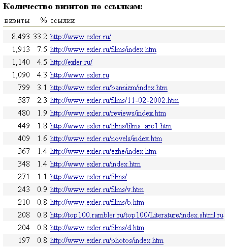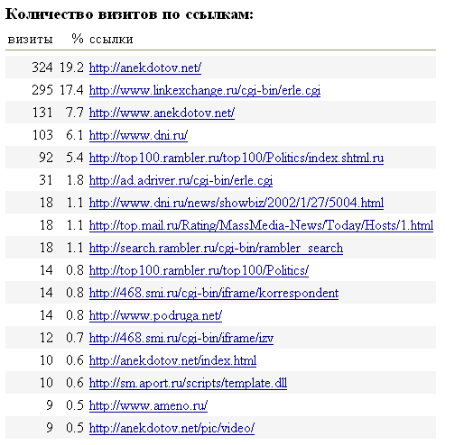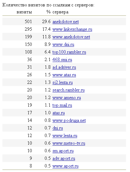 Она с высокой долей достоверности показывает, из чего складывается посещаемость сайта Exler.ru. На момент получения статистики счетчиком было зафиксировано примерно 39 000 визитов (не уникальных посетителей, коих было зафиксировано примерно 7000, а визитов), из которых 1 711 визитов было произведено по вышеуказанным ссылкам. То есть примерно 4,25% моих посетителей приходит с посторонних серверов. Это, в общем, довольно ничтожный процент, который означает, что у меня своя устоявшаяся аудитория, а по рекламе (или просто по ссылкам) приходит не более 5% посетителей.