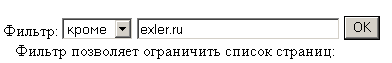 Статистика ссылок с самого Exler.ru нам портит картину, поэтому воспользуемся возможностью исключить из отчета сам сайт Exler.ru. Для этого слева снизу надо отметить пункт меню "кроме" и вписать exler.ru: