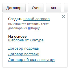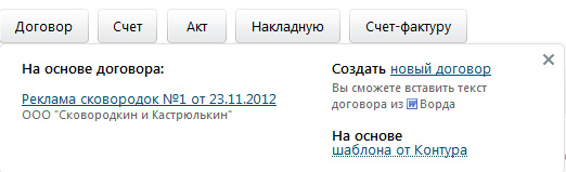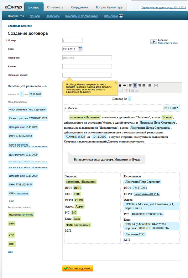 Идем в закладку "Договор". Там можно создать новый договор, вставив текст со своими пунктами в заготовленную форму, а можно вызвать готовый шаблон.