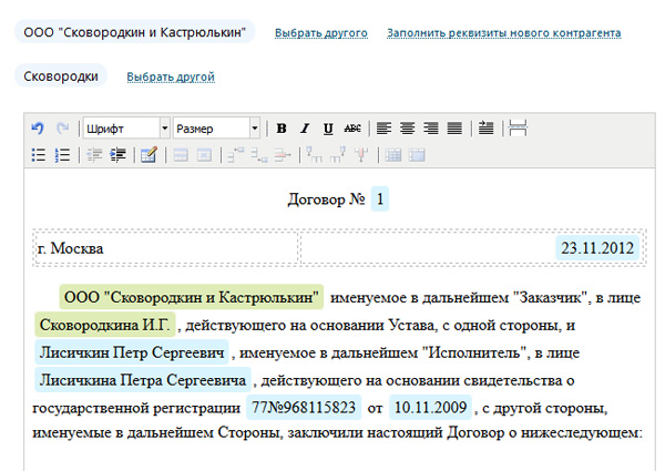При заполнении поля "Клиент" предлагается сразу ввести реквизиты клиента, после чего они сохранятся в базе и одновременно попадают в договор.