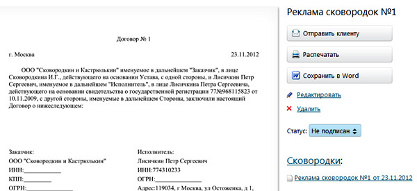 После сохранения договора его можно отправить клиенту, распечатать, изменить.