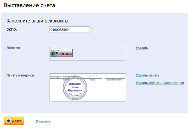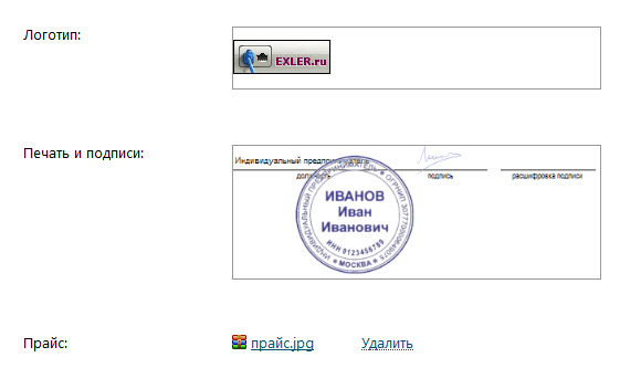 Причем в настройках для бизнеса также можно загрузить свою печать с подписью, логотип и прайс-лист.