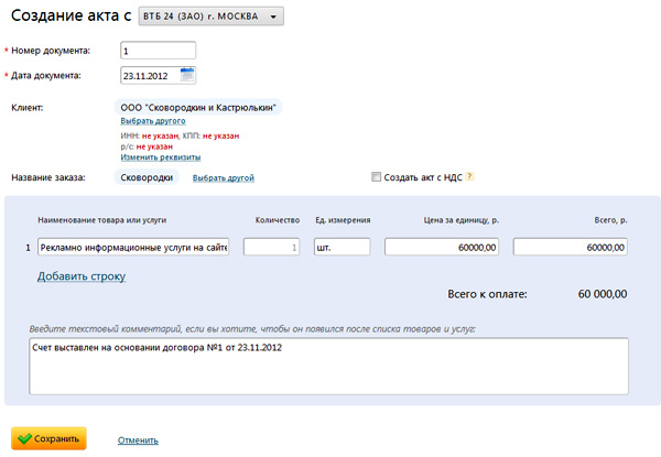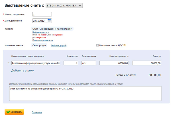 При заполнении счета можно выбрать клиента и ввести комментарий.